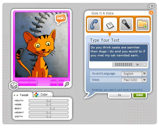 The VOKI website features videos created by teachers illustrating how they use VOKI in the classroom. Watch this video of Mr. Young’s classroom to learn from his students how they use VOKI to help them review their writing.  One student realizes his text doesn’t make sense, another  decided that he needs more sentences, a third notices that periods are missing, and a fourth hears mispronunciations that some spellings need correction.
