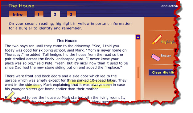 Teachers may want to project this on a digital display for the whole class or allow students to work in pairs on a computer then discuss their how their highlighted text changes depending on the purpose for reading. Students come to see how highlighting a text can help them pay greater attention to what it says, as well. The digital highlighter and eraser tools are easy and fun to use. To try it, click here then choose “The House Interactive” link.