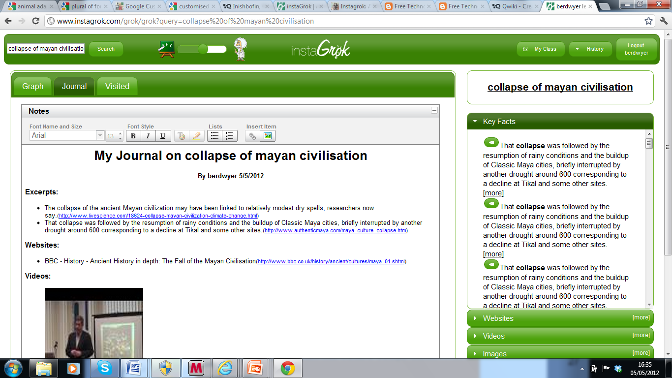 To grok, the developers tell us is to ‘understand thoroughly and intuitively’. Instagrok presents a visual graph of the key concepts related to a topic. You can click on any of the key concepts to investigate that concept more thoroughly. In addition, on the right hand side of the screen, you can view key facts related to the topic¸ web sites, videos, images, and quiz topic questions related to the topic. You can pin any of these representations on to the visual graph. See my screen shot related to a grok I conducted related to the collapse of the Mayan civilisation. There is also a slide bar at the top of the screen to adjust the level of difficulty of the information presented. What really excites me about Instagrok is that you can also create a journal, which is automatically generated, as you annotate the visual graph. See the screen shot of the journal below. As Instagrok allows the teacher to create student accounts you can view the work of students in these journals.
